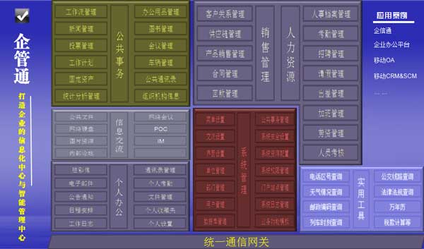 系统具有五大业务能力模块:公共事务、销售管理、人力资源、信息交流、个人办公、系统管理、实用工具。各功能模块自成一体可单独作为一个独立业务系统,各功能模块内部和功能模块之间又能根据企业的需要灵活配置、组合、调整,满足不同企业的信息化需求。