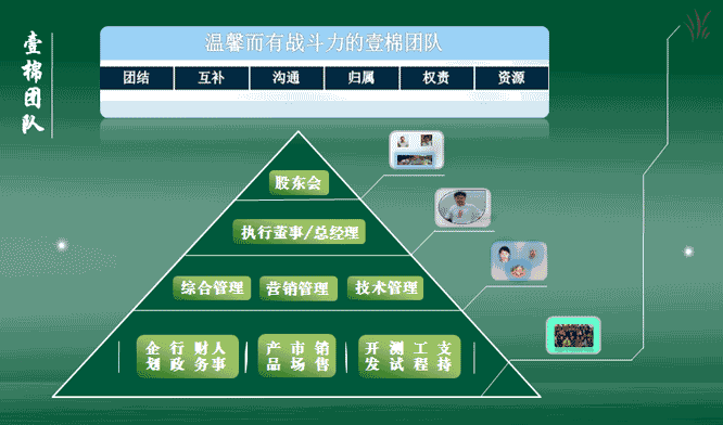 壹棉的管理架构,遵循简单、直接、高效原则,充分体现创业型公司的高效率及高灵活特性。