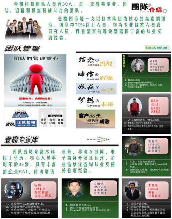 壹棉科技团队人员20余人,是一支团结、温馨和极富有战斗力的团队。团队成员全部本科以上学历,核心管理及技术人员平均年龄33岁,具有丰富的IT从业及相关管理经验。按照人数量比例划分:技术研发团队65%,营销及管理团队35%。